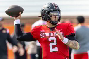 After Devin Leary played under new Bucs offensive coordinator Liam Coen for one season at Kentucky, it’s no surprise to see Tampa Bay interview him informally at the Combine. At 6-foot-1, 215 pounds, Leary resembles Baker Mayfield in his build, and has a similar playing style. Leary struggled with accuracy with the Wildcats (56.3%) and turnovers (12 INTs), but stayed healthy and wound up throwing 25 touchdowns, too.