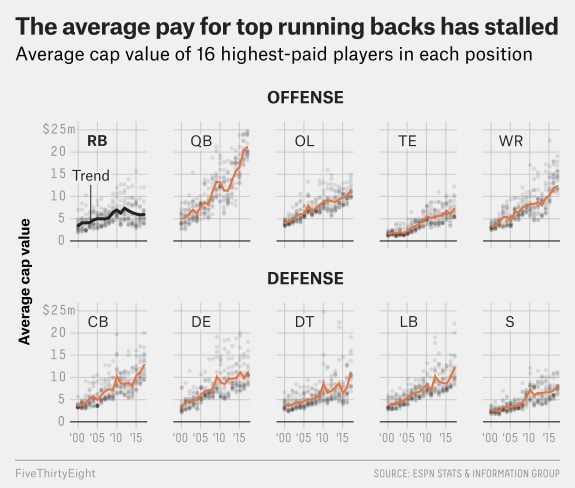 Contract numbers reflect this, too – remember, you can tell what a team really believes in by where it puts its money. People can lie, smokescreen, and say whatever they want, but when it comes to putting money on the line, those with money don’t like putting it in places they don’t think they will get a positive return on investment. This chart from FiveThirtyEight explains that, as the salary cap has gone up, and thus the numbers for most positional contracts with it, running back contracts have actually gone down.