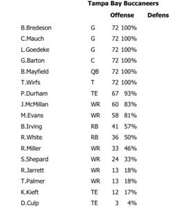 Safeties Kaevon Merriweather and Mike Edwards split their snaps right down the middle 31 snaps and 52% each. Christian Izien at 93% played almost the whole game at strong safety. Only two players on defense – cornerback Jamel Dean and linebacker Lavonte David – played 100% in the entire game.